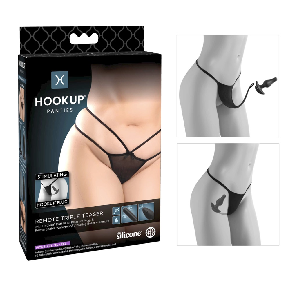 Hookup Panties are designed to stimulate you with every subtle movement. Once inserted, the plug will securely hold the H-string in place as it teases, pleases, tugs and pulls with your natural, everyday body motion. 10-Function, Waterproof, Vibrating, Rechargeable Bullet with Remote. The waterproof vibrating bullet features 10 stimulating pulsation patterns and includes a wireless remote so that you (or a partner) can control the action from up to 25 feet away. Ergonomic Elite SiliconeTM Pleasure Plug allows for the waterproof vibrating bullet to be securely inserted inside of it, delivering thrilling vibrations exactly where you want them most. 1 USB Cord Charges Both Bullet & Remote.
